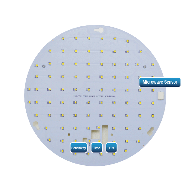 Complete with integral microwave sensor, switching on when required and off when the room is unoccupied. The sensor has adjustable time sensitivity and lux settings for optimum energy savings.