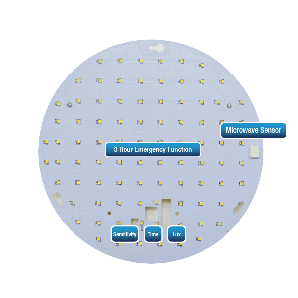 Complete with integral microwave sensor, switching on when required and off when the room is unoccupied. The sensor has adjustable time sensitivity and lux settings for optimum energy savings. Also with 3 hour backup emergency function. If mains power fails the unit will automatically switch to emergency mode. The unit will run at 20% power and operate for a minimum of 3 hours in backup mode.