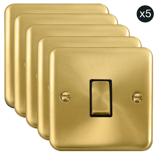 5 PACK - Curved Satin Brass 10AX Ingot 1 Gang 2 Way Light Switch - Black Trim