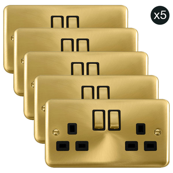 5 PACK - Curved Satin Brass 13A Ingot 2 Gang DP Switched Plug Socket - Black Trim