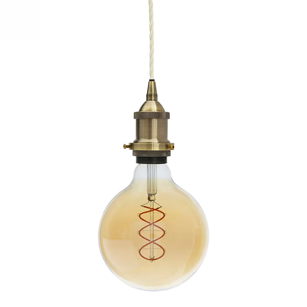 This antique brass decorative bulb holder pendant light works as a standalone exposed bulb pendant light, or you can use the shade ring to append your own light shade (Max 1.8 Kilos) with a 42mm diameter opening. With an E27 (Edison Screw - E27) fitting, this fitting works with dimmable and non-dimmable bulbs and has a 1.5 metre drop, which can be adjusted if needed.