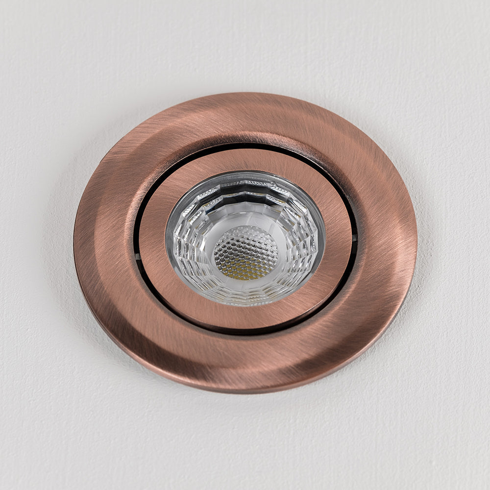 This tiltable antique copper LED downlight from our collection of beautiful dimmable fire rated downlights has a 2.8K Colour temperature. The tiltable design allows you to choose the angle of the light to suit the room.