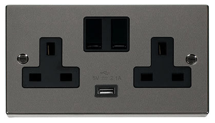 Black Nickel 2 Gang 13A 1 USB Twin Double Switched Plug Socket - Black Trim