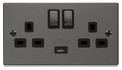 Black Nickel 2 Gang 13A DP Ingot 1 USB Twin Double Switched Plug Socket - Black Trim