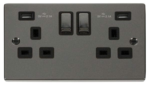 Black Nickel 2 Gang 13A DP Ingot 2 USB Twin Double Switched Plug Socket - Black Trim
