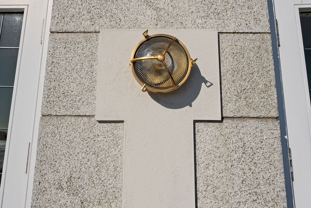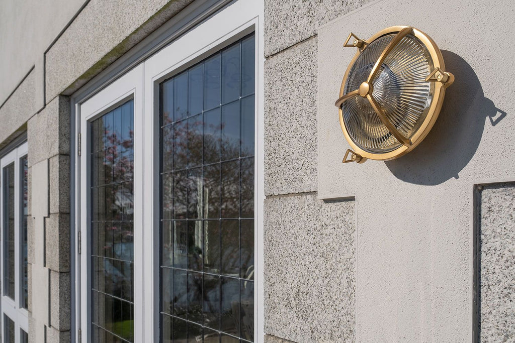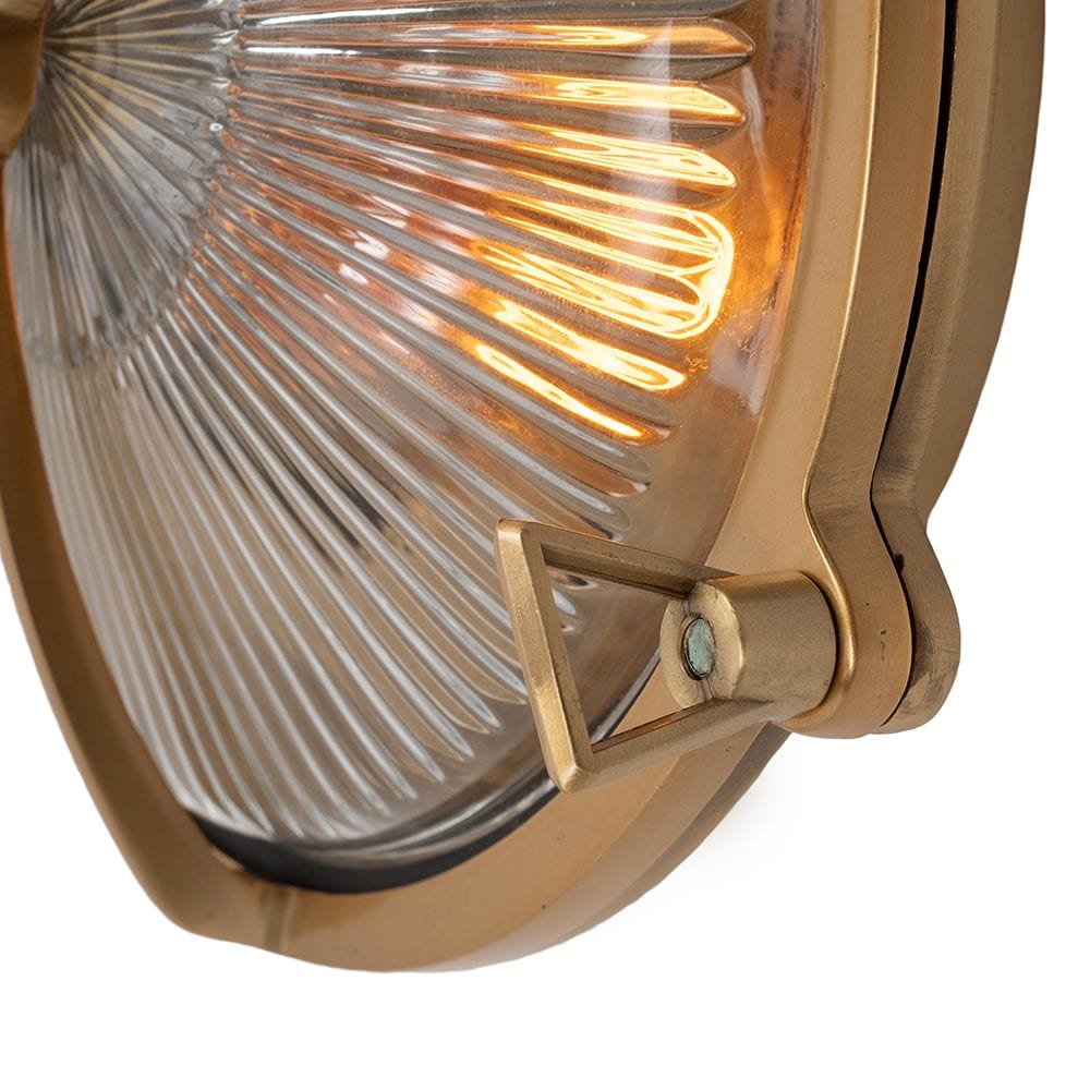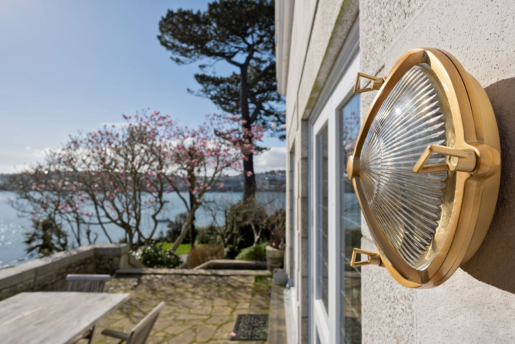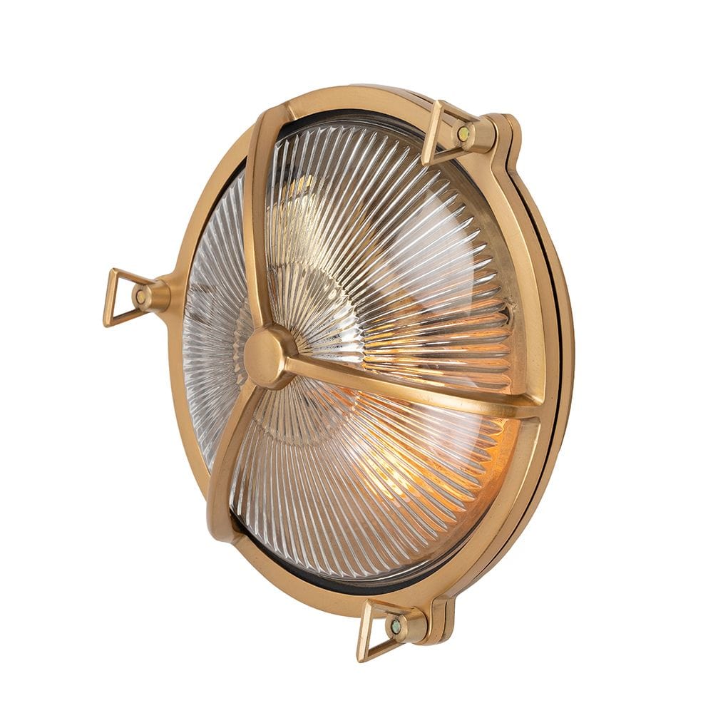 This beautiful statement outdoor light combines a bulkhead style wall light with prismatic glass and a removable copper cover for a wonderfully unique look. The three bolts holding it together, along with the etched glass and reflective, honeyed finish give this an almost Victorian nautical or steampunk appearance, perfect for industrial or period settings. IP66 Rated.