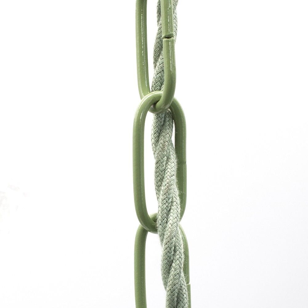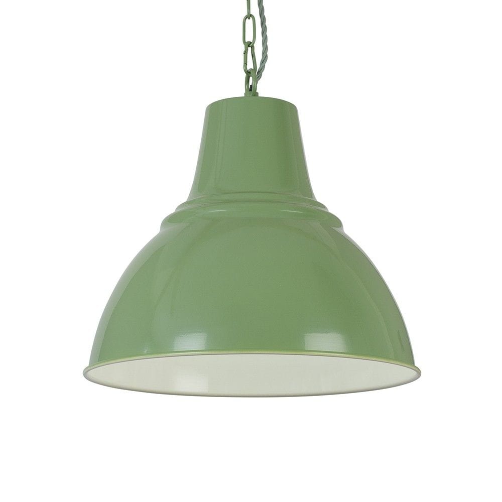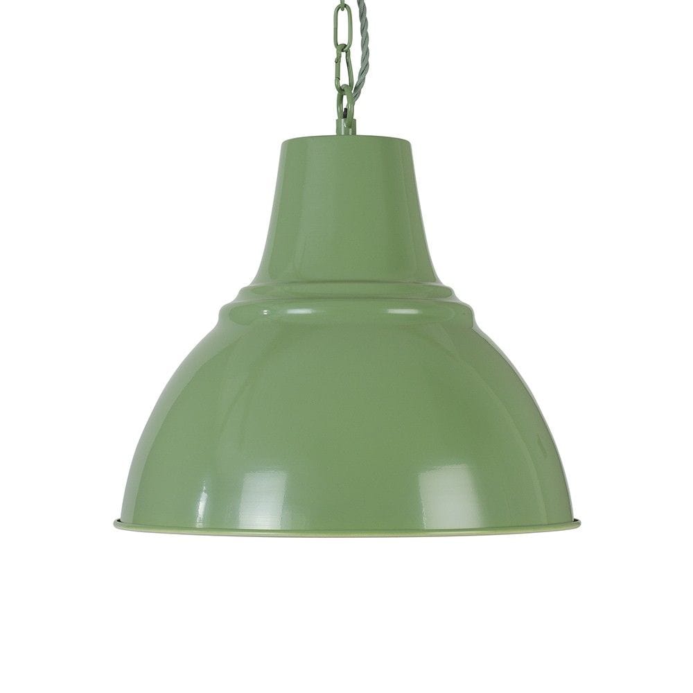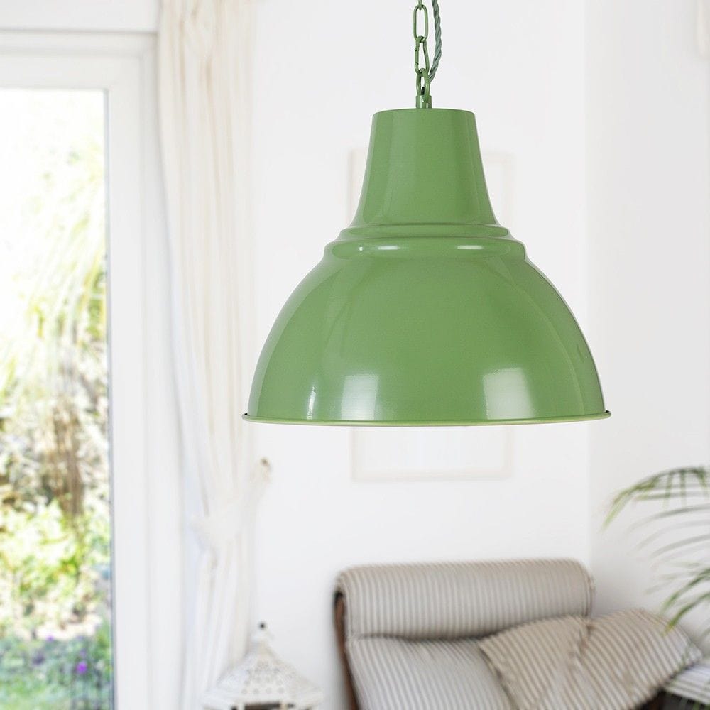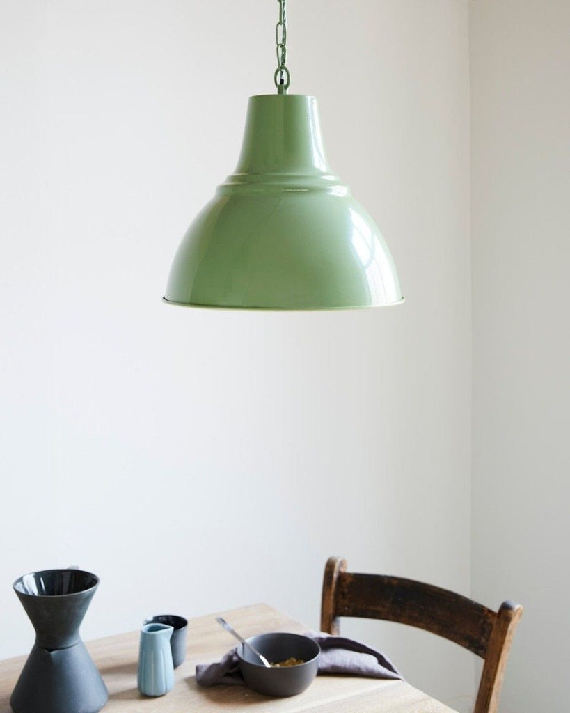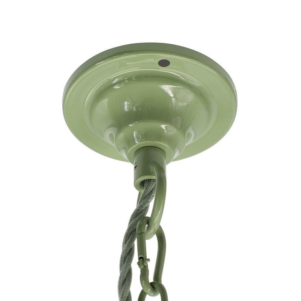 The Caged Bell Pendant in chalk green is glorious with its industrial style and bell shape.