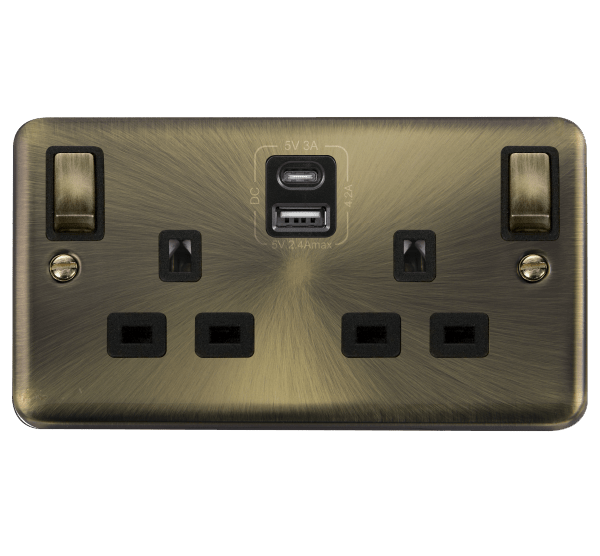 Curved Antique Brass 2 Gang 13A DP Ingot Type A & C USB Twin Double Switched Plug Socket - Black Trim