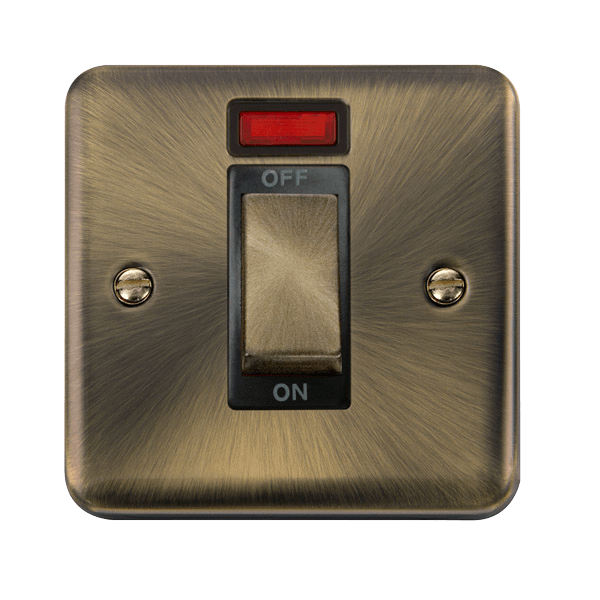 Curved Antique Brass 45A Ingot 1 Gang DP Switch With Neon - Black Trim