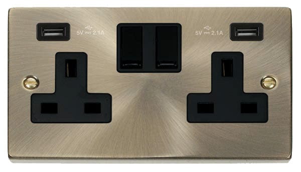 Antique Brass 2 Gang 13A 2 USB Twin Double Switched Plug Socket - Black Trim