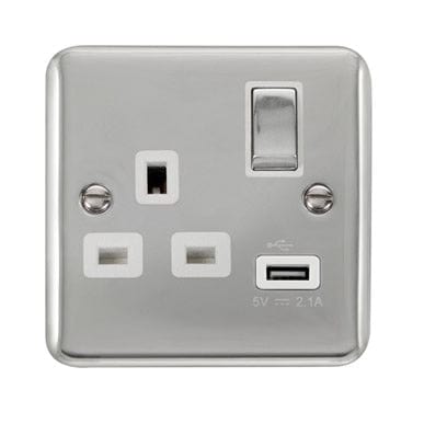 Curved Polished Chrome 13A Ingot 1 Gang Switched Socket With 2.1A USB Outlet - White Trim