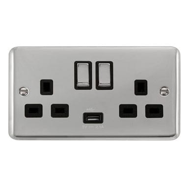 Curved Polished Chrome 13A Ingot 2 Gang Switched Sockets With 2.1A USB Outlet (Twin Earth) - Black Trim
