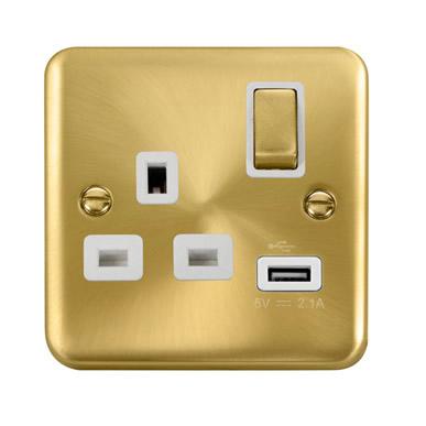 Curved Satin Brass 13A Ingot 1 Gang Switched Plug Socket With 2.1A USB Outlet - White Trim