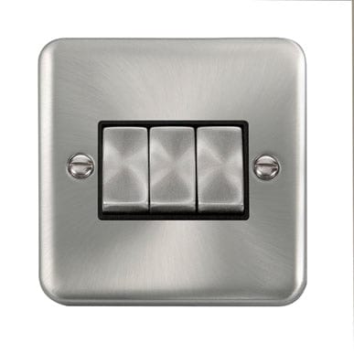 Curved Satin Chrome 10AX Ingot 3 Gang 2 Way Plate Switch - Black Trim