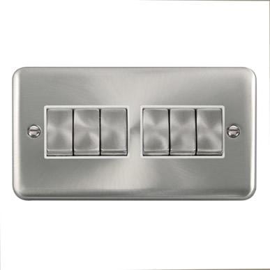 Curved Satin Chrome 10AX Ingot 6 Gang 2 Way Plate Switch - White Trim