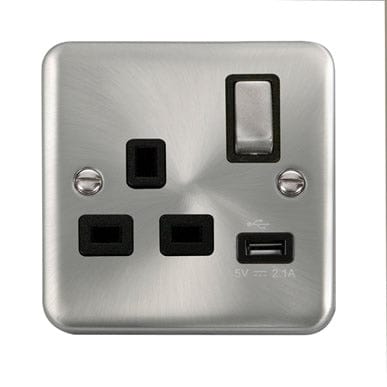 Curved Satin Chrome 13A Ingot 1 Gang Switched Socket With 2.1A USB Outlet - Black Trim