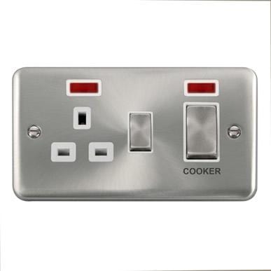 Curved Satin Chrome 45A Ingot 2 Gang DP Switch With 13A DP Switched Socket & Neons - White Trim