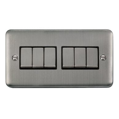 Curved Stainless Steel 10AX Ingot 6 Gang 2 Way Plate Switch - Black Trim