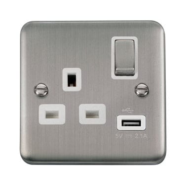 Curved Stainless Steel 13A Ingot 1 Gang Switched Socket With 2.1A USB Outlet - White Trim