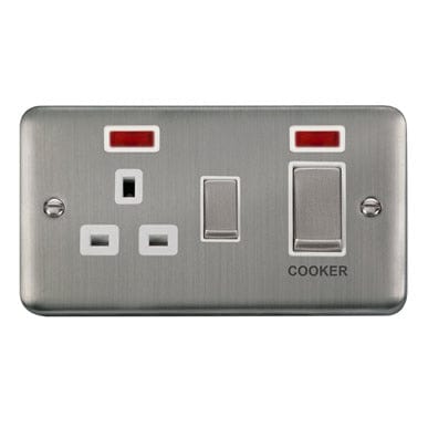 Curved Stainless Steel 45A Ingot 2 Gang DP Switch With 13A DP Switched Socket & Neons - White Trim