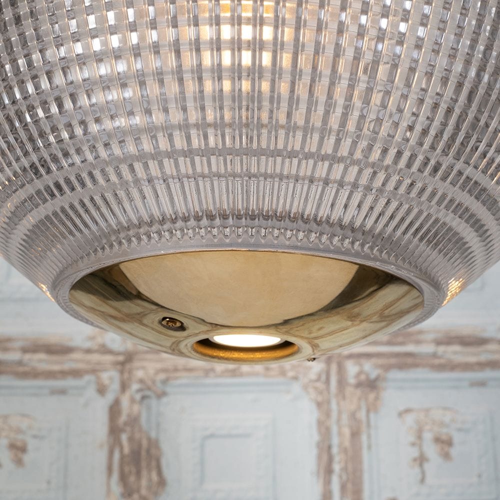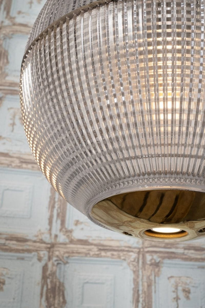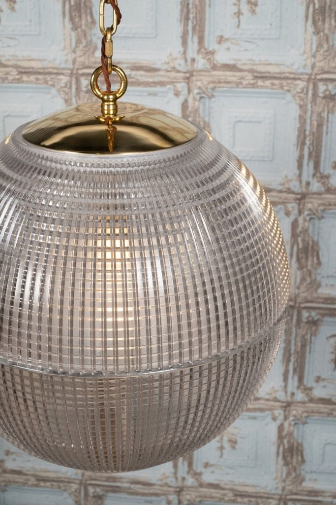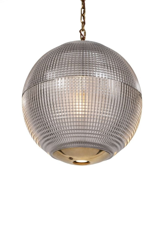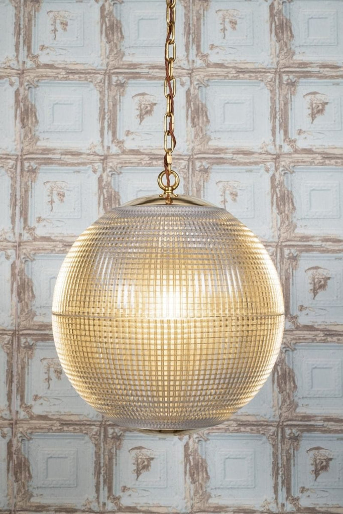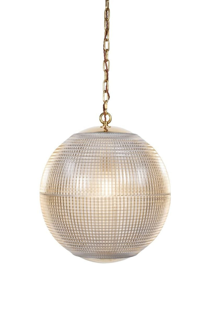 Inspired by the 1950s Paris Holophane Globe Street Light, this iconic prismatic sphere design once lit the thoroughfares of the French Capital. Transformed from the practical to the sophisticated and stylish, the textured prismatic glass of the Hollen Globe provides a combination of up light and down light which projects a wonderfully even distribution of light, without casting shadow or glare. The solid brass base, cap and chain, reinforces the quality of this impressive, iconic pendant.