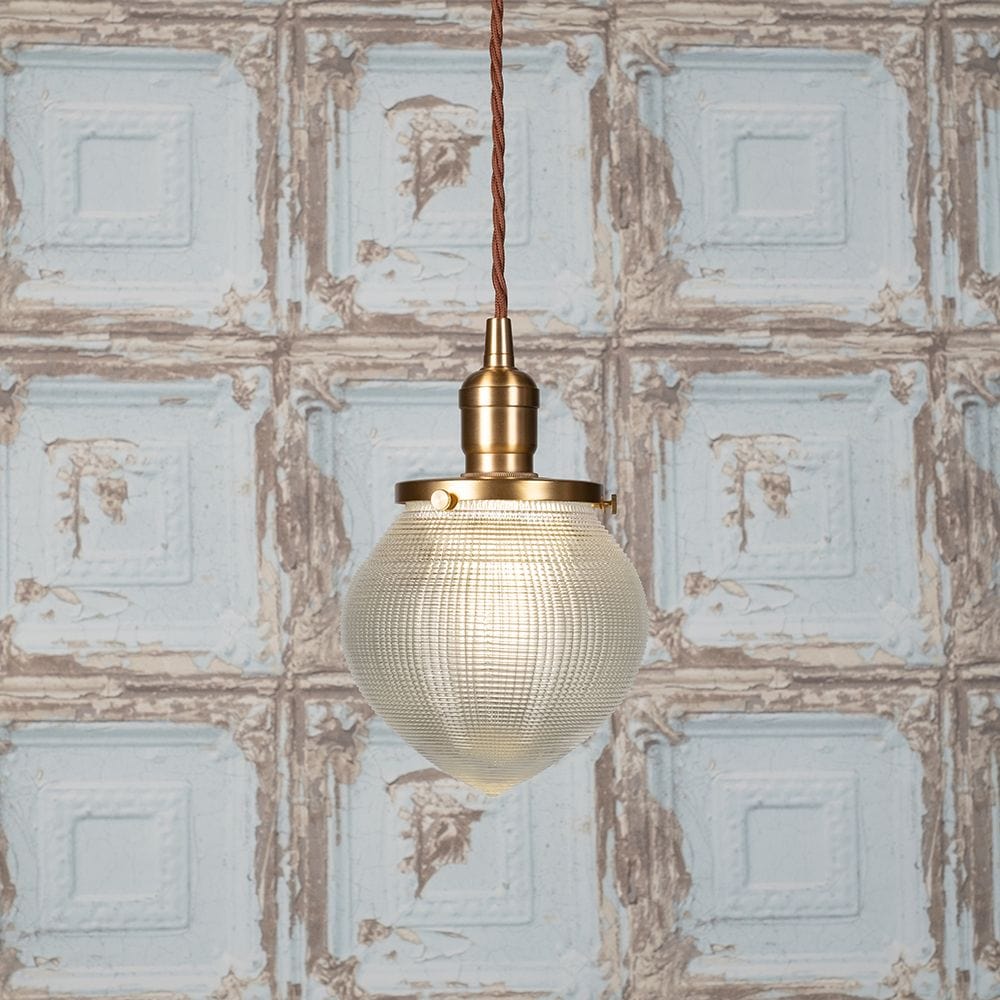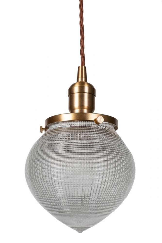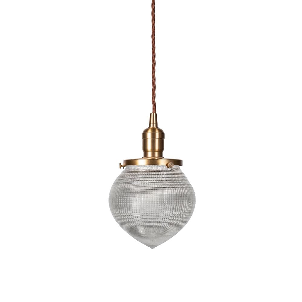 Petite and sophisticated, the Hollen Acorn industrial pendant features an Acorn shaped prismatic Holophane style glass shade topped with a solid brass cap. Originating in style from the 1930's, this pendant looks sensational when hung in multiples - either in a row or grouped at differing heights. The textured cut glass gives off a fabulous distribution of light and different coloured bulbs can be used to create different moods.