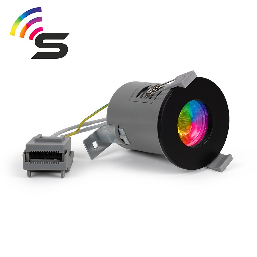 This colour changing smart downlight consists of a GU10 IP65 fire rated downlight and a smart LED GU10 bulb. Fire rated to 60 and 90 minutes, and robustly built with 2 connector clips for easy installation.