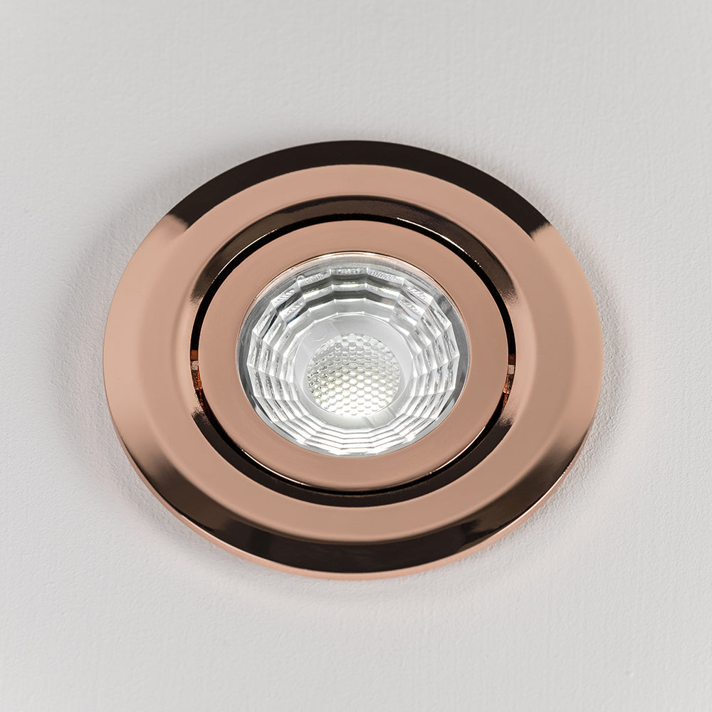 This tiltable brushed copper LED downlight from our collection of beautiful dimmable fire rated downlights has a colour temperature of 2.8k. The tiltable design allows you to choose the angle of the light to suit the room.