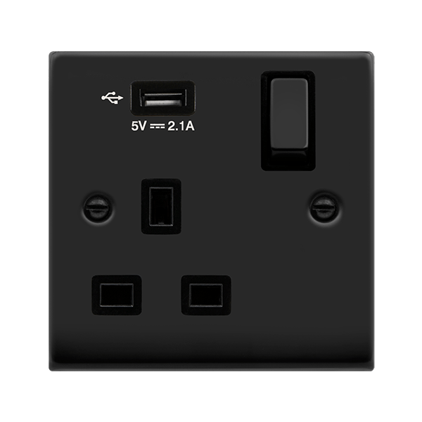 Matt Black 1 Gang 13A DP Ingot 1 USB Switched Plug Socket - Black Trim