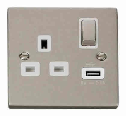 Pearl Nickel 1 Gang 13A DP Ingot 1 USB Switched Plug Socket - White Trim
