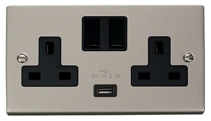 Pearl Nickel 2 Gang 13A 1 USB Twin Double Switched Plug Socket - Black Trim