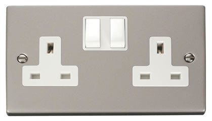 Pearl Nickel 2 Gang 13A Twin Double Switched Plug Socket - White Trim