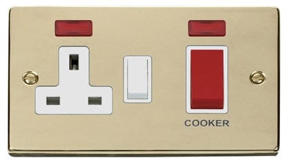 Polished Brass Cooker Control 45A With 13A Switched Socket & 2 Neons - White Trim