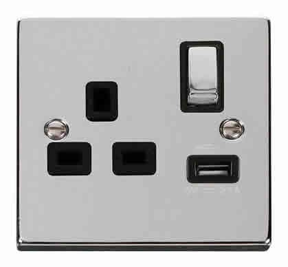 Polished Chrome 1 Gang 13A DP Ingot 1 USB Switched Plug Socket - Black Trim