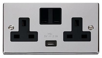 Polished Chrome 2 Gang 13A 1 USB Twin Double Switched Plug Socket - Black Trim