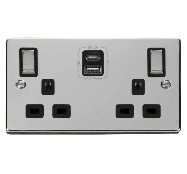 Polished Chrome 2 Gang 13A DP Ingot Type A & C USB Twin Double Switched Plug Socket - Black Trim
