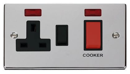 Polished Chrome Cooker Control 45A With 13A Switched Plug Socket & 2 Neons - Black Trim