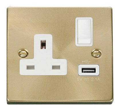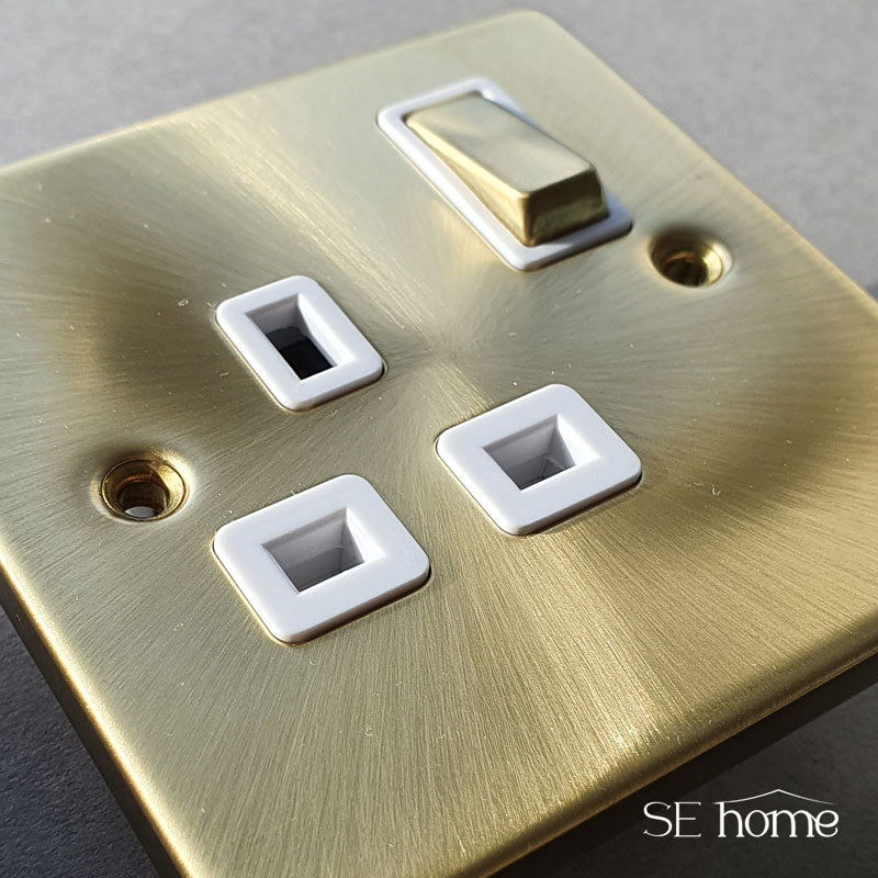 Satin Brass 1 Gang 13A DP 1 USB Switched Plug Socket - White Trim