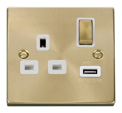 Satin Brass 1 Gang 13A DP Ingot 1 USB Switched Plug Socket - White Trim