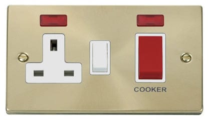 Satin Brass Cooker Control 45A With 13A Switched Plug Socket & 2 Neons - White Trim