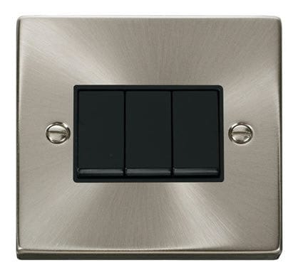 Satin Chrome 10A 3 Gang 2 Way Light Switch - Black Trim