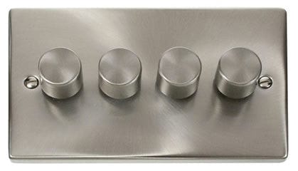 Our Satin / Brushed Chrome raised plate, dimmer light switches are beautifully crafted with a sleek profile. With a choice of LED compatible or rotary options available. Each plate has a subtle brushed spiral effect from the plate centre.