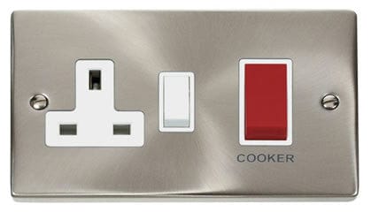 Satin Chrome Cooker Control 45A With 13A Switched Plug Socket - White Trim