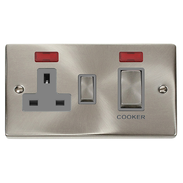 Satin Chrome Cooker Control Ingot 45A With 13A Switched Plug Socket & 2 Neons - Grey Trim
