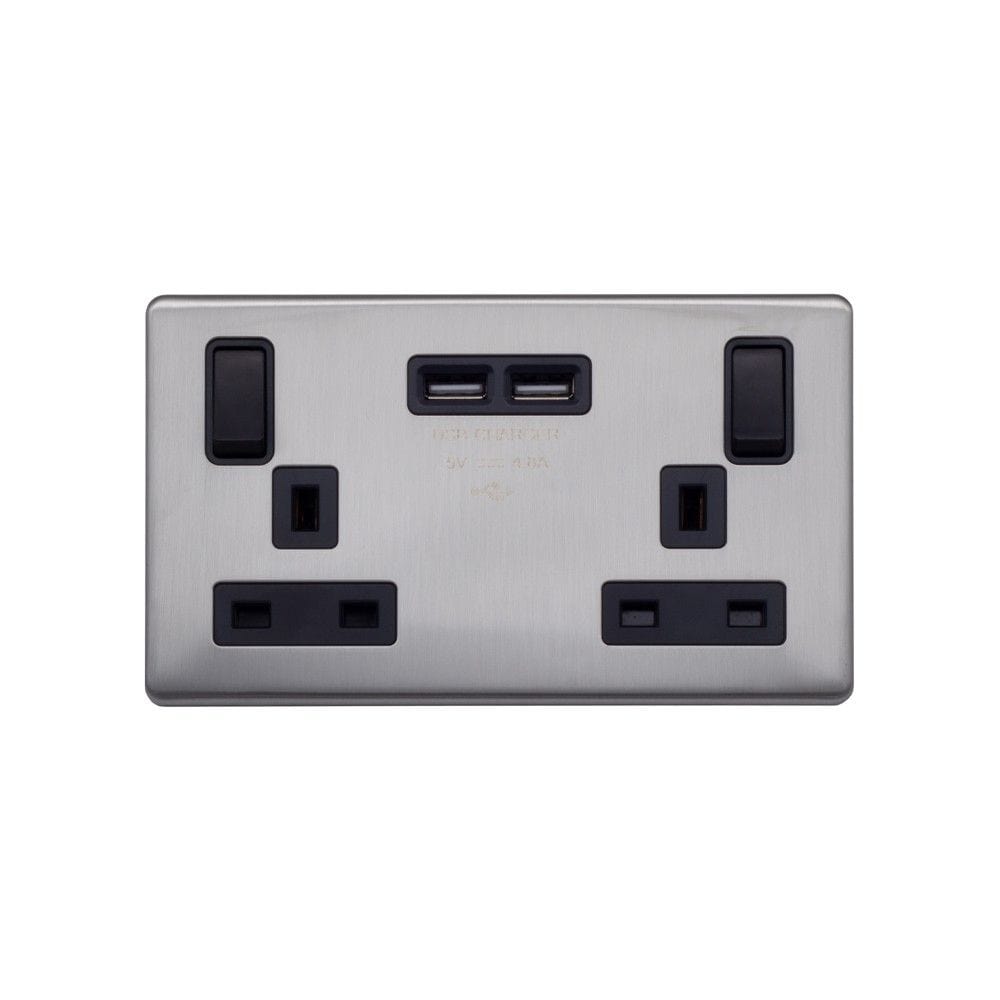With a brushed finish to reduce fingerprints and reflection, this screwless Brushed Chrome 13A 2 Gang Switched DP Socket 2xUSB Outlet (4.8A) with black Trim from Speedy Electrical offers quality and style at a competitive price.