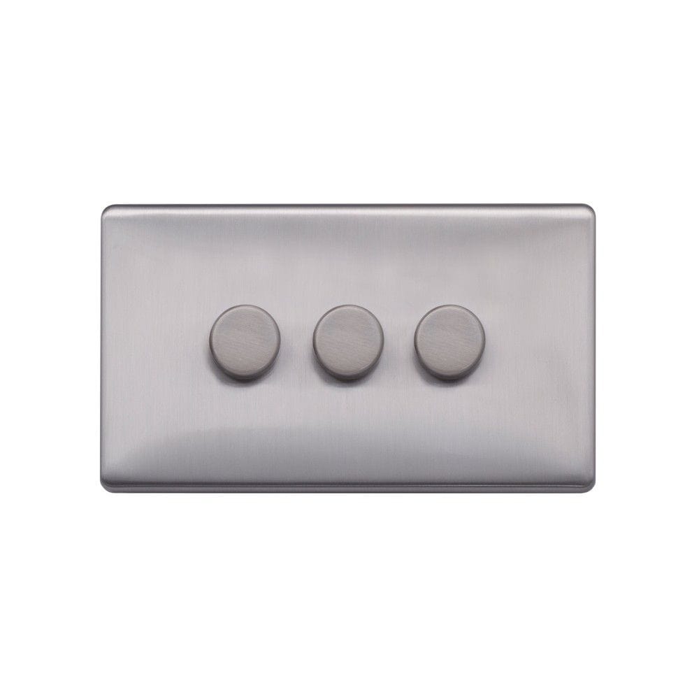 With a brushed finish to reduce fingerprints and reflection, this screwless Brushed Chrome 100W LED 3 Gang 2 Way Intelligent Trailing Dimmer Switch from Speedy Electrical offers quality and style at a competitive price.