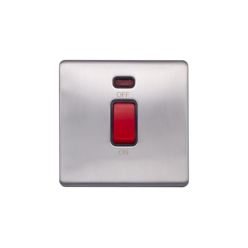 With a brushed finish to reduce fingerprints and reflection, this screwless Brushed Chrome 45A 1 Gang Double Pole Switch, Single Plate with black Trim from Speedy Electrical offers quality and style at a competitive price.