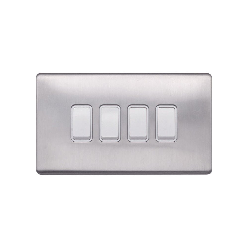 With a brushed finish to reduce fingerprints and reflection, this screwless Brushed Chrome 10A 4 Gang 2 Way Light Switch with white Trim from Speedy Electrical offers quality and style at a competitive price.