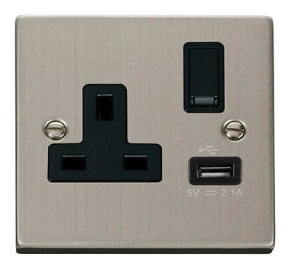 Stainless Steel 1 Gang 13A DP 1 USB Switched Plug Socket - Black Trim