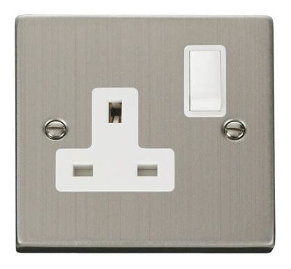 Stainless Steel 1 Gang 13A DP Switched Plug Socket - White Trim